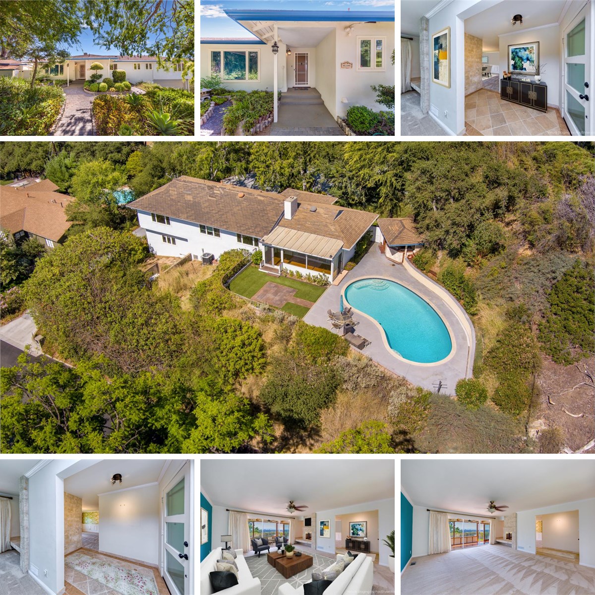 A sparkling pool with a stunning view and mature landscaping creates the perfect setting for outdoor enjoyment and relaxation. The property also features a studio guest house above the second two-car garage, offering flexible space for visitors, a home office, or a creative retreat.