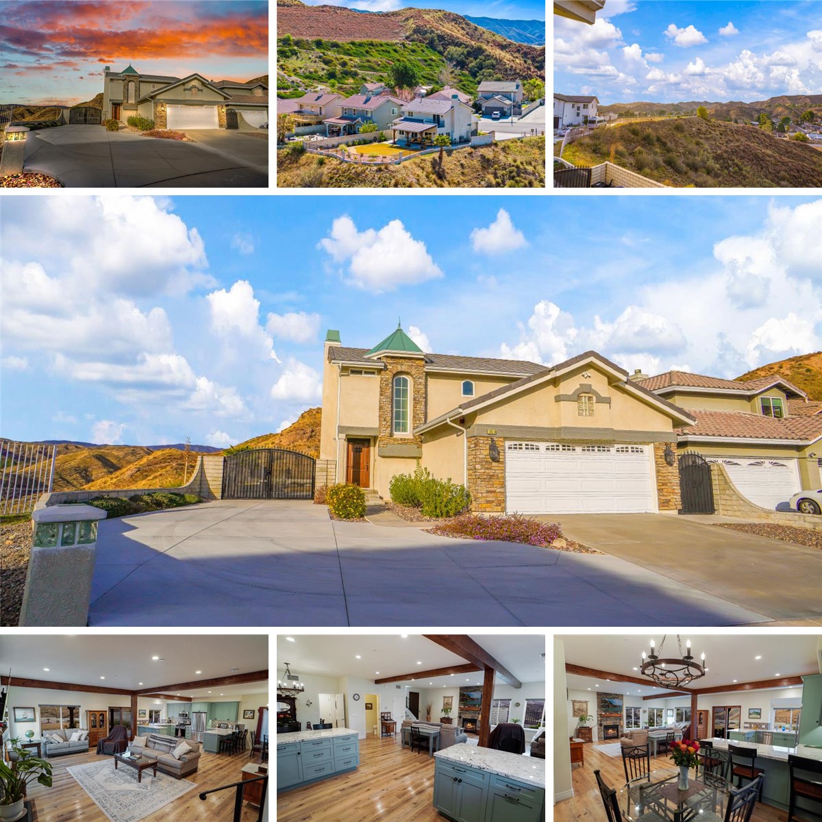 Welcome to 14519 Stone Ridge Ct, Santa Clarita. Where you can become the proud owner of “The Little Castle on the Hill” Situated at the end of a quiet cul-de-sac street and offering incredible 270 DEGREE VIEWS on a large 12,114 SQ FT lot AND almost completely redesigned and rebuilt in 2021 - it’s truly in move-in condition and this home is the ONE you’ve been waiting for!!! Drenched in natural light, the home elegantly blends modern comforts with charm, and embraces a breathtaking indoor-outdoor flow. The great room is complimented by stunning wood beamed ceilings, a cozy gas fireplace and overlooks the dining area and the cook’s kitchen with gorgeous countertops and backsplashes, tons of cabinet space, two breakfast bars and stainless steel appliances. Gleaming floors seamlessly flow throughout the first floor of the home with high end carpeting upstairs and tile in the bathrooms. The primary suite is a relaxing retreat with vaulted ceiling, a view balcony, and a private bathroom. The property is thoughtfully landscaped with drought saving plantings, a great outdoor covered patio / sitting area, and ample space to build a pool and/or BBQ center. The property provides a perfect environment for relaxation and entertaining in nature while being centrally located within the city. A direct access 2-car garage and the long driveway with gated RV with dump station and EV Plug makes this one perfect for all your toys and hobbies The Area is Extremely Quiet and the night sky is a Stargazers Delight!! Additionally there are No HOA dues. This RARE find is sure not to last long, see it today!