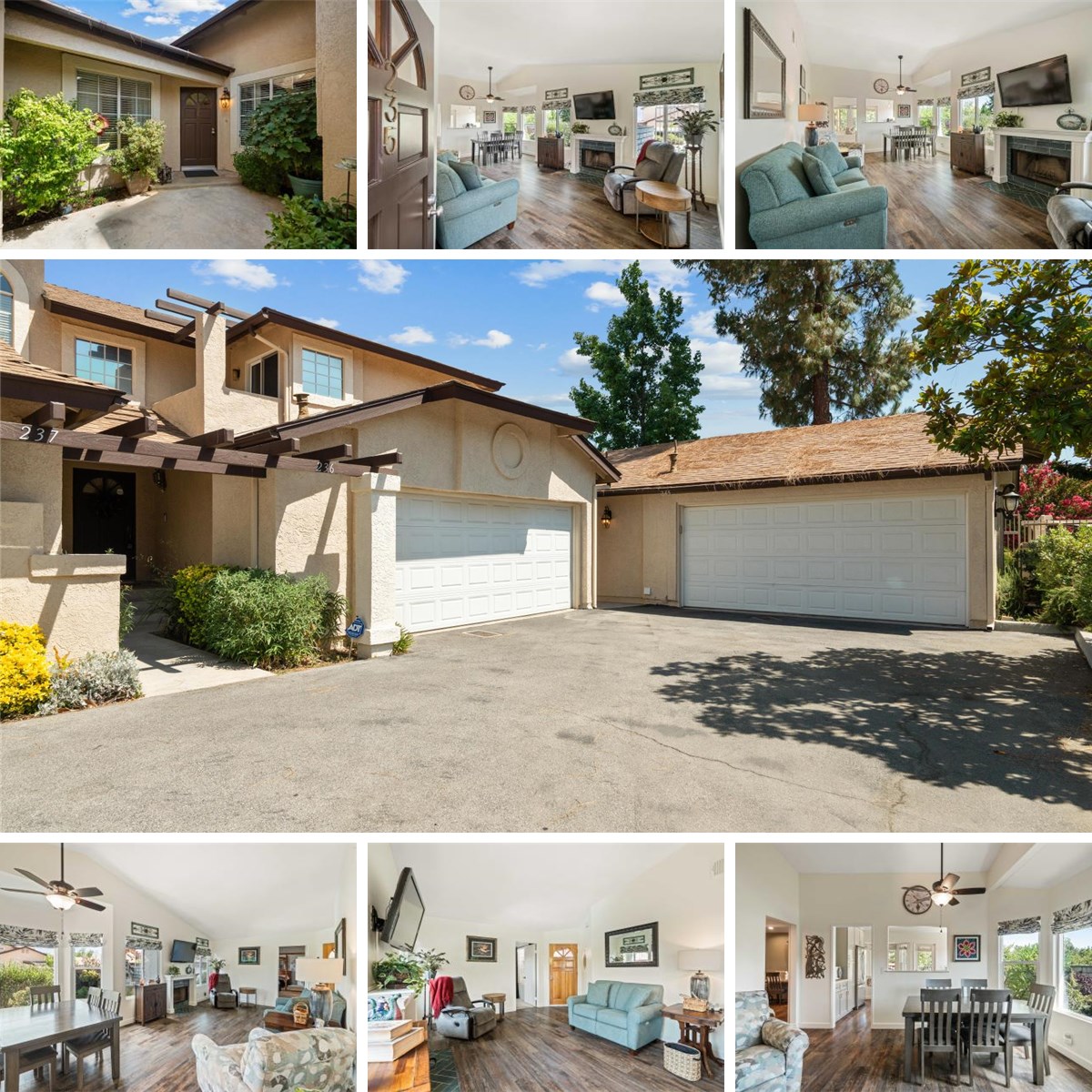 FHA approved and move-in ready, this 3-bedroom, 2-bathroom end unit in Mountain View Courtyards offers single-story convenience and a rare backyard view that looks out across the valley. Inside, you'll find a bright, open layout with a fireplace, updated flooring, and custom window treatments throughout. The kitchen has been opened up to the dining area and finished with quartz counters, upgraded cabinetry, stainless steel appliances, and a bay window with bench seating. The primary suite features mirrored closet doors and a remodeled bathroom with a walk-in shower, while the secondary bedrooms share another upgraded bath. Step outside to a private wraparound yard with pavers, a covered patio, lush flowers, and plenty of space to entertain or unwind. Other highlights include a two-car garage with built-in storage and laundry area, low HOA, no Mello Roos, and access to a community pool, spa, and nearby parks, trails, and dining.