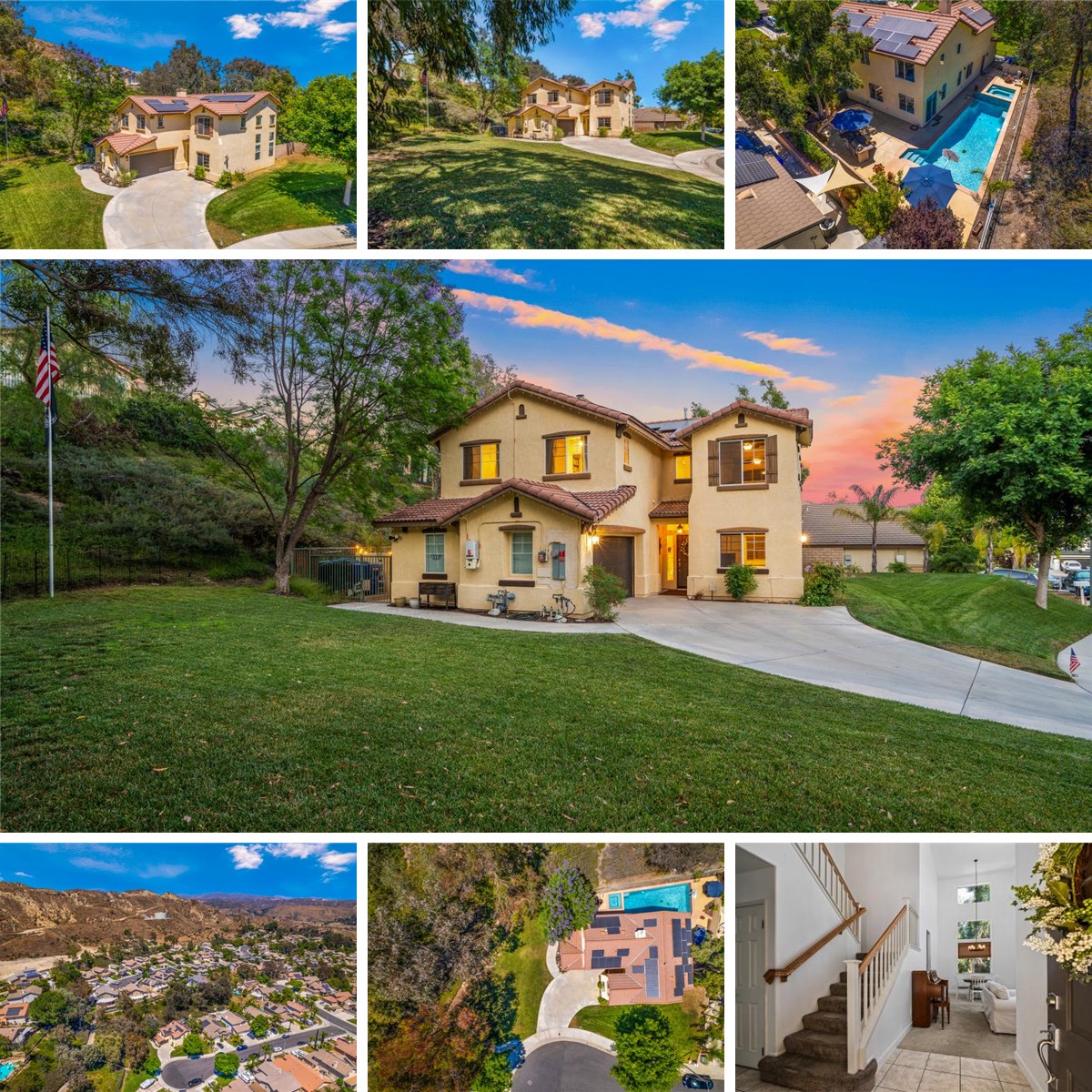 ONE OF THE KIND END OF CUL-DE-SAC POOL HOME on 28,000 sq ft lot! This uniquely oriented property with a large park-like front yard with mature trees, sprawling lawn and lush hillside shrubs is unparalleled in Castaic. Step inside to soaring vaulted ceilings over the spacious entertainer's living room with adjacent dining and direct access to the kitchen. Large high windows provide incredible natural light. Downstairs offers two bedrooms and a full bath. Kitchen is upgraded with granite counters and stainless steel appliances, Kitchen has a center island and built-in extra serving credenza, perfect for staging food for outdoor entertaining. The family room directly adjacent to the kitchen offers a cozy fireplace and media area for viewing your favorite entertainment. Upstairs is the spacious Primary Suite and Primary bath with dual sinks, glass shower and soaking tub and walk in closet. Secondary rooms are generous including the extra large front bedroom over the garage which could be divided and returned to the original 6th bedroom. Downstairs, step outside to this unique and sprawling outdoor living space. Custom designed rectangular pool and elevated spa with custom hardscape, built-in BBQ with bar seating and raised brick fire pit. Easy walk, bike or drive to Castaic Middle School and Castaic Elementary School. Minutes to shopping and Downtown Valencia Town Center. Quick access to 5 freeway for easy commuting. Must See this property to truly appreciate it!