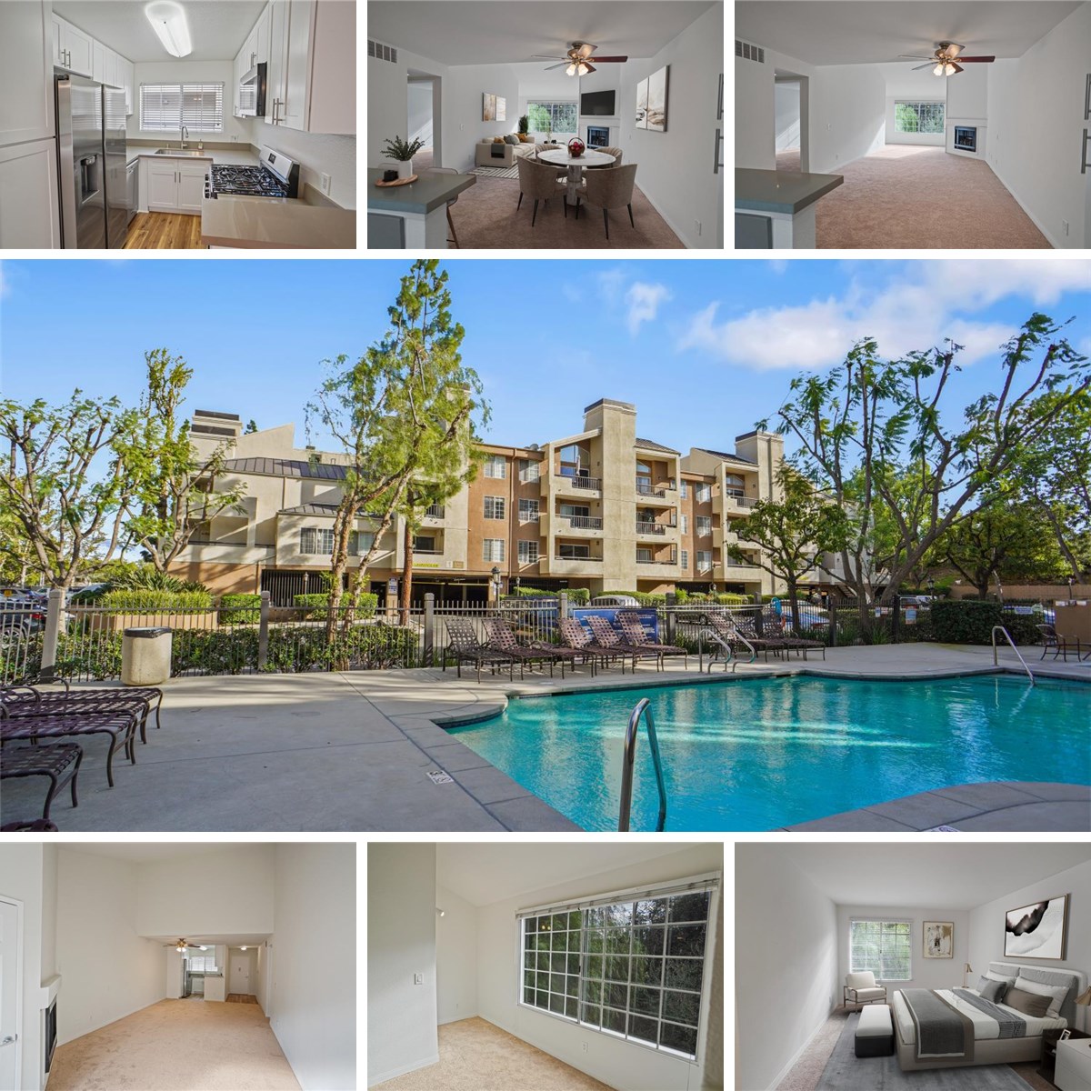 Swanky, Upscale 2 Bedroom 2 Bath Penthouse with Open Floorplan at The Met. November 2025 Remodeled Kitchen with White Shaker Cabinets, Gray Quartz Countertops, Stainless Steel Appliances (Refrigerator Included), and Stainless Steel Undermount Sink. Dining Area Adjacent to Kitchen. Living Room with Dramatic 2 Story Ceilings and Cozy Fireplace. Primary Suite has Ensuite Bath with White Cabinets, Granite Countertop and Dual Sinks, Tub/Shower with Glass Enclosure, and Mirrored Wardrobe Doors. Hallway Bath with Tub/Shower Combination with Glass Enclosure, White Vanity, and Granite Countertop. Secondary Bedroom with Mirrored Wardrobe Doors. There is a Laundry Cabinet for Stackable Washer and Dryer (included). The Unit has New Luxury Laminate Flooring at the Entry, Kitchen and Baths. Unit has been Freshly Painted and has New Carpet. This Unit includes 2 Covered Tandem Parking Spaces. The Met is a 24-Hour Guard Gated Resort Like Community with 4 Pools, Lighted Tennis Courts, Gym, Kids Play Area and Verdant Grounds. Come Live and Play at the Met at Warner Center! VA Approved Complex.